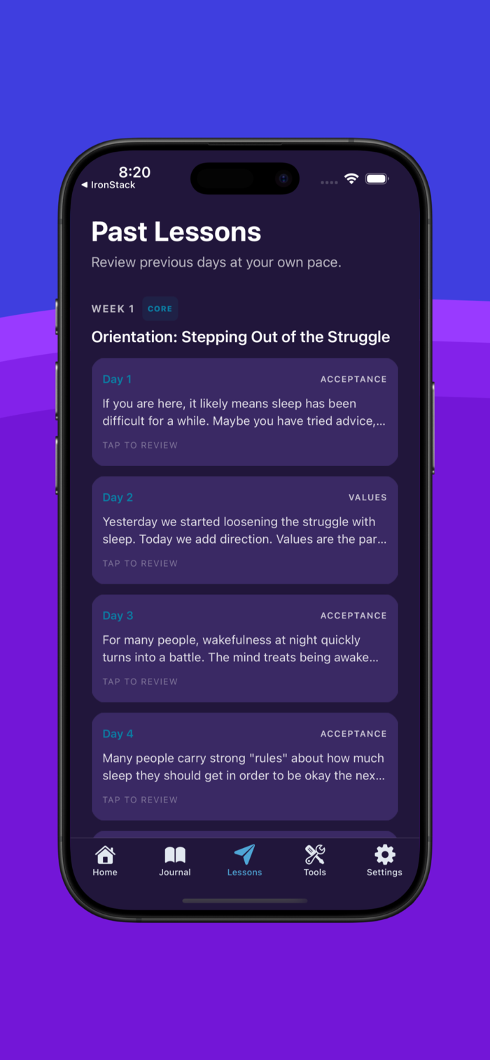 RestWise Sleep是一款受失眠接纳与承诺疗法启发的自助式失眠辅助应用。它帮助失眠、思绪纷飞或有睡眠焦虑者,改变与睡眠的关系,不再强行对抗。通过30天的课程、反思及练习,提供平静实用的方法。内容包括30天结构化课程,介绍应对失眠和夜间焦虑的ACT原则;还有应对思绪纷飞的解离工具,可让人从侵入性思维中抽离,减少夜间心理挣扎。