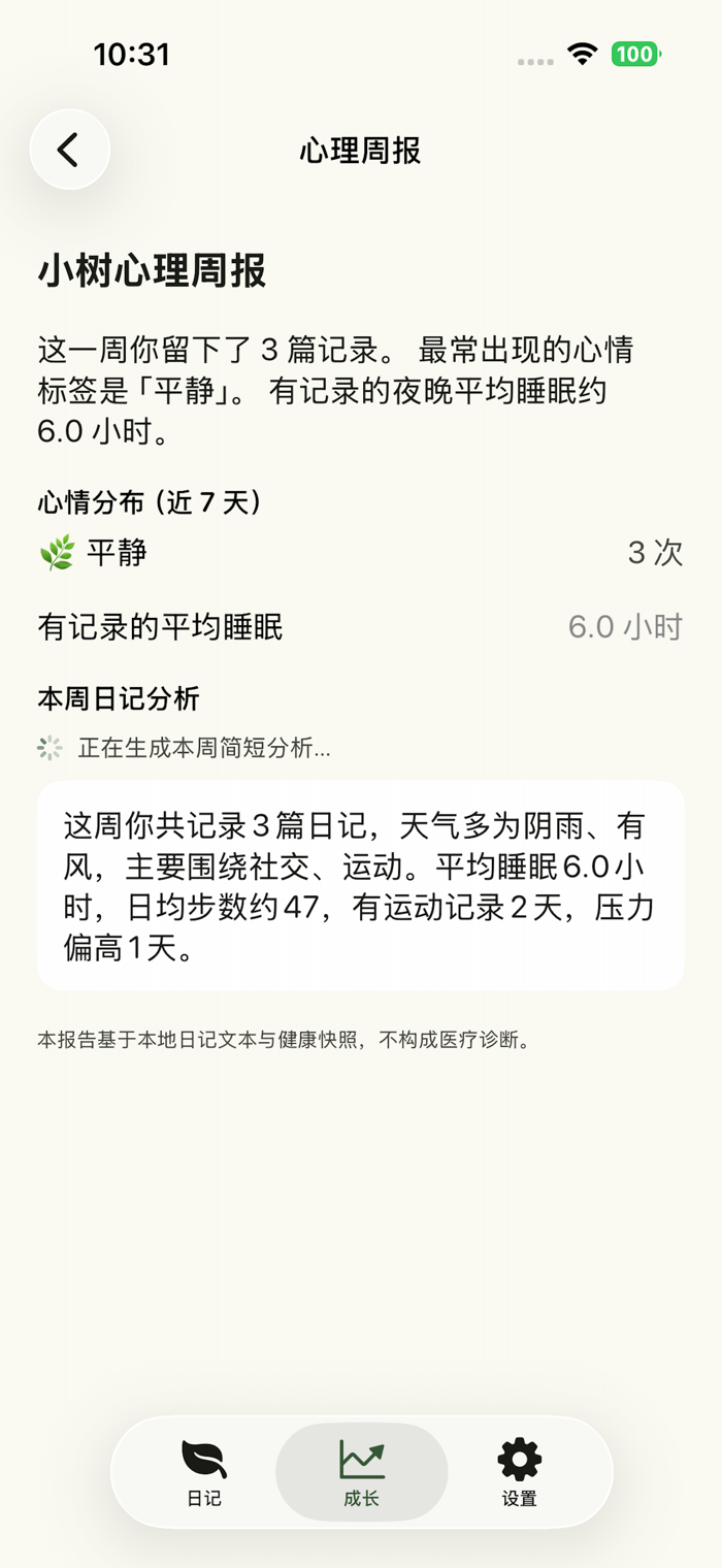 小树日记是一款把「心情」与「苹果健康」里的睡眠、心率、运动、正念放在同一时间轴上的隐私向日记。支持语音记录、设备端 AI 镜像反馈与周报复盘,帮助你看见身体节律与情绪之间的关联——应用不提供医疗诊断或治疗建议。