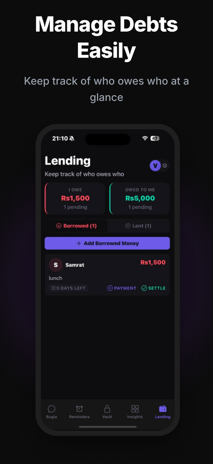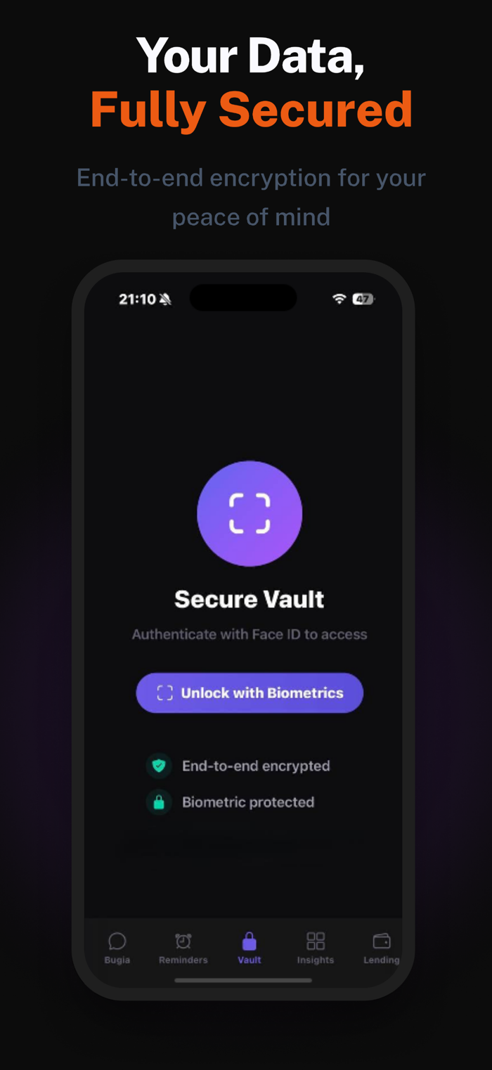 With Bugia, you can log expenses and income, set bill and payment reminders, monitor personal loans, and keep sensitive financial details in a secure vault. The built-in AI assistant helps you understand your finances, answer questions, and generate personalized insights based on your activity.