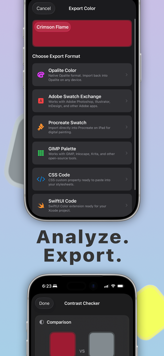 Pick colors from photos, check WCAG contrast, simulate color blindness, and export palettes to Procreate, SwiftUI, CSS, and Adobe — all in one app. Opalite is the color toolkit designers, developers, and digital artists actually need.