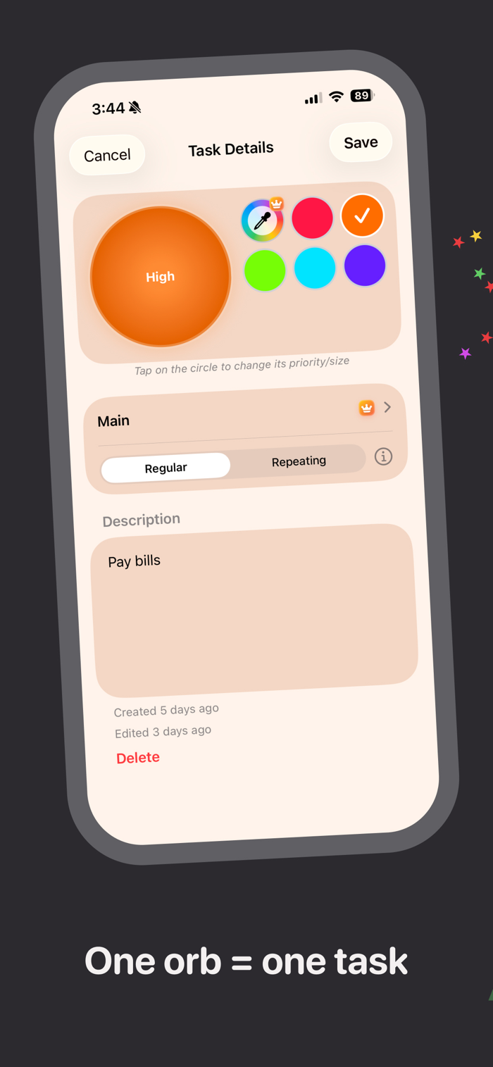 Create your tasks into task orbs. You choose the orb's size, color, and position on the board. Easily drag task orbs, and burst them when they're completed. Orble gives you control over the visual layout of your list to make task completion simple and effective.