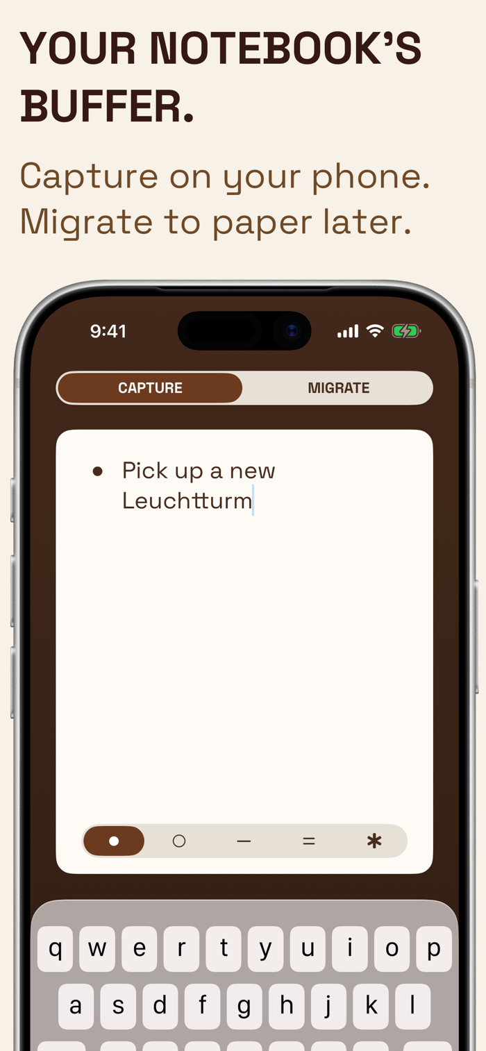 Roost is a temporary inbox for bullet journalers — designed to complement your physical journal, not replace it. Open, capture a thought with the right signifier, and get back to your day. When you're ready, migrate everything to your notebook one card at a time.