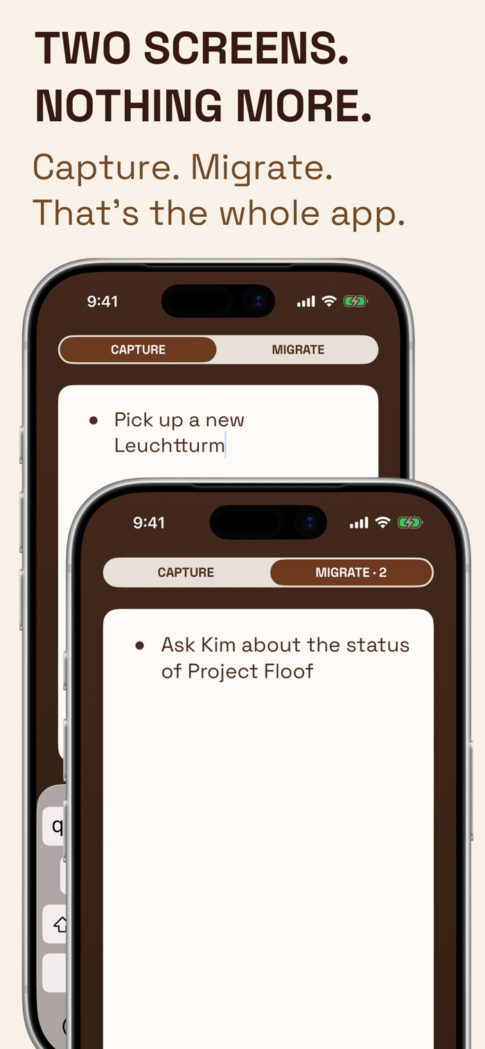 - Migrate: A card stack shows one capture at a time. Swipe to clear. No cherry-picking, no skipping. Items are permanently deleted — just like crossing them off paper.