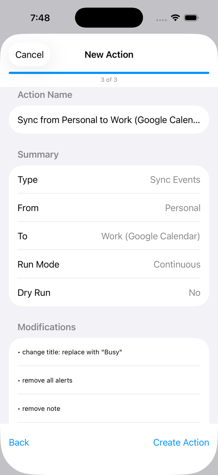 该产品可在设备上自动私密地同步日历事件、阻止时间、删除不需要的事件并批量修改事件。支持在iCloud、Google Calendar、Outlook等日历间复制事件,能在同步到工作日历时清除个人事件信息,可按特定标准智能删除、批量修改事件,具备后台处理且对电池损耗小,注重隐私,处理均在本地,iCloud可用于存储配置和日志,还有灵活匹配及试运行模式。