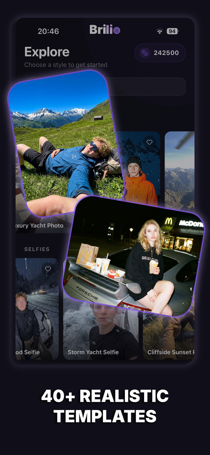 Upload one photo and watch Brilio transform it using professionally designed AI templates. From studio portrait lighting to private jet settings, each template is crafted to deliver stunning, share-worthy results every time.