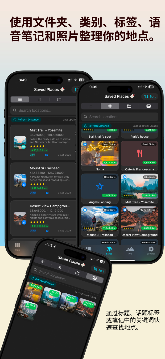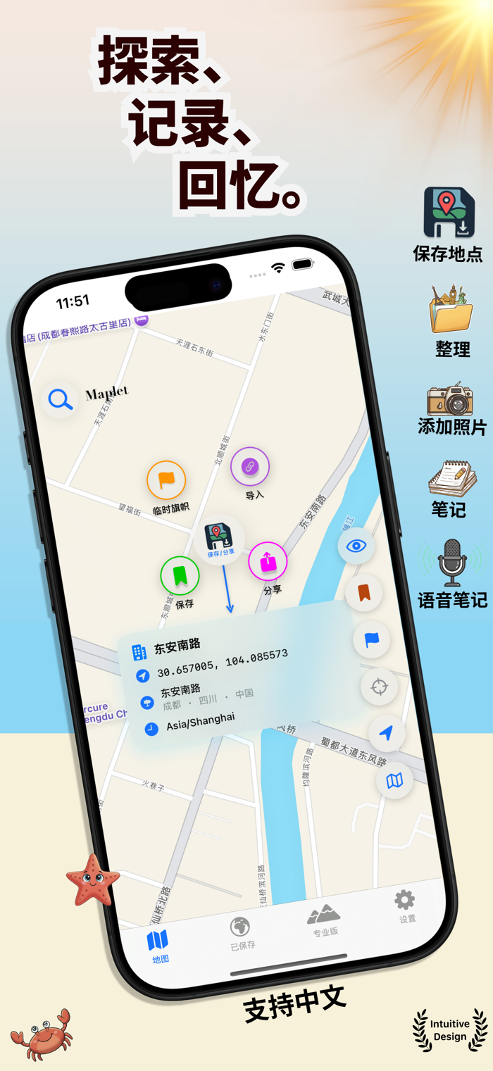 [地图标记与打卡足迹] • 保存任意地点:一键记录标题、照片、语音备忘录及详细地址。