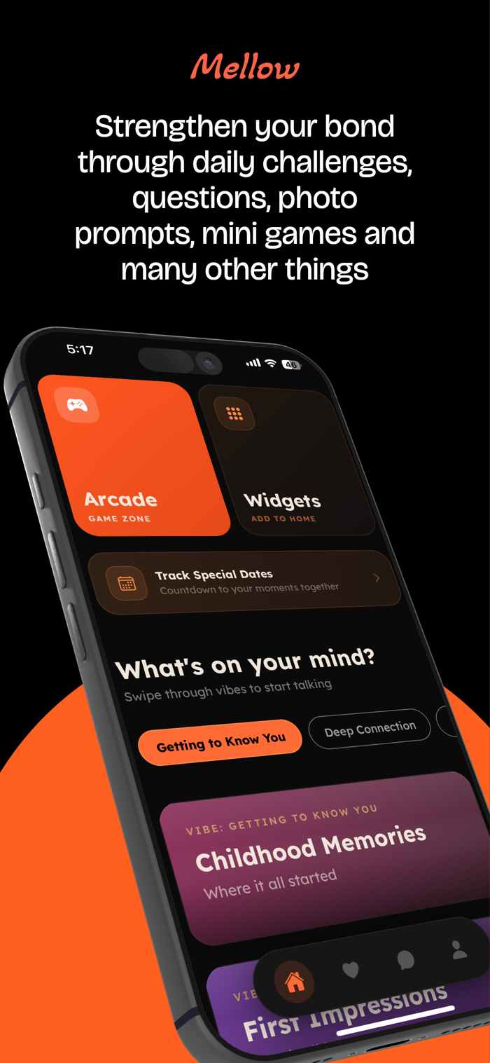 Mellow是一款增进伴侣关系的应用程序。它有每日心情签到及连胜追踪,提供诸如“你愿意吗”等情侣游戏、共享绘图画布、深度问题卡组,能设置特殊日期倒计时,可写密封信给未来的自己。还有Relationship Wrapped功能,将共享活动转化为个性化回顾。此外,具备主屏幕小部件、每日挑战等。免费使用。