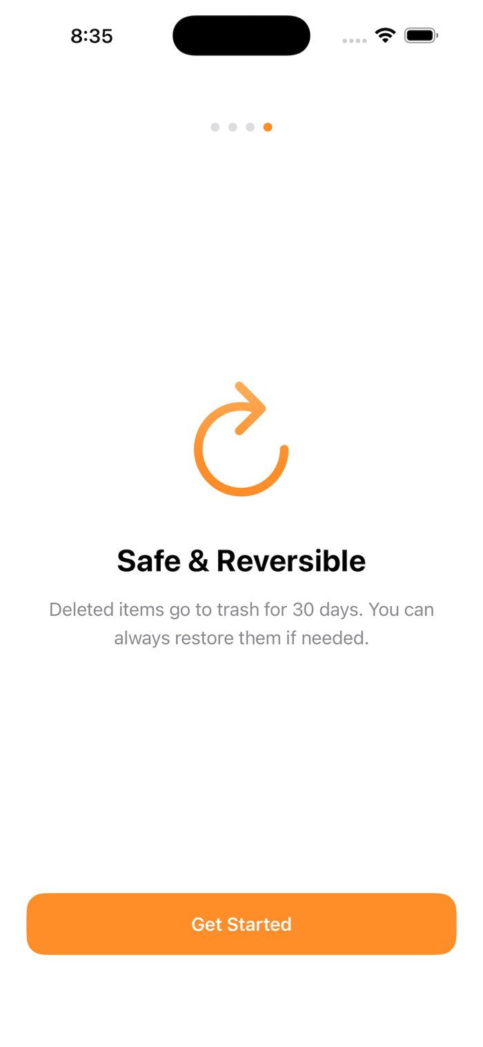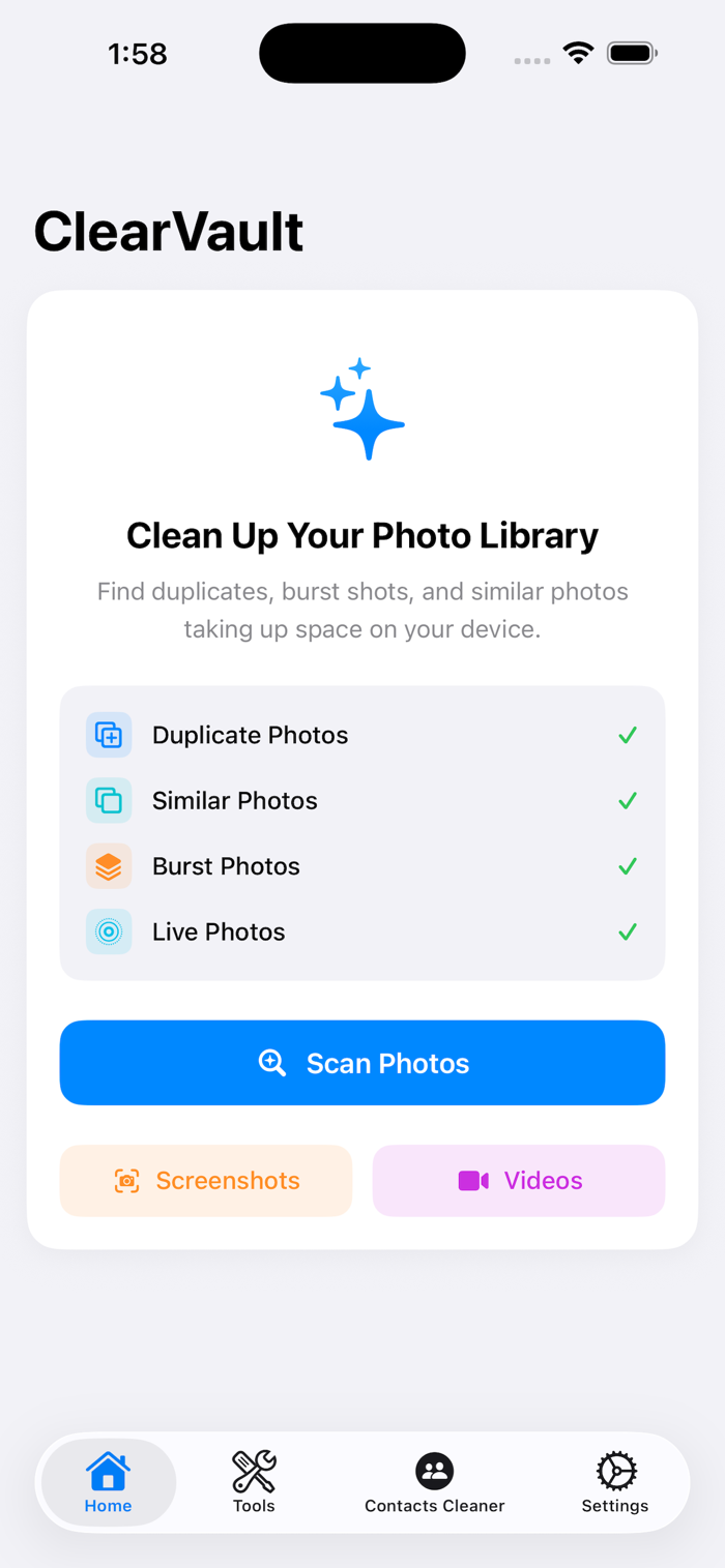 It helps you find and review duplicate photos, similar images, blurry shots, screenshots, large videos, and duplicate contacts. You always review items before deleting or merging, so you stay in control of your data.