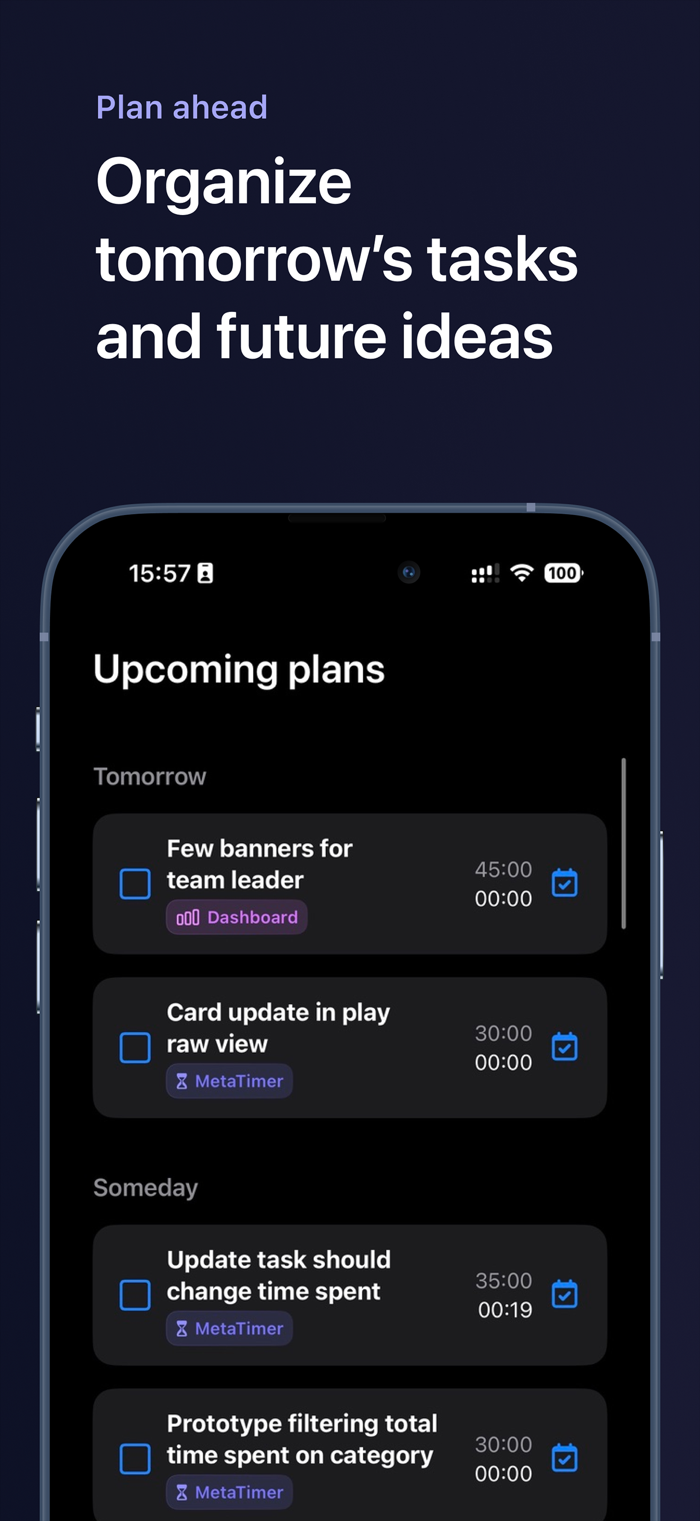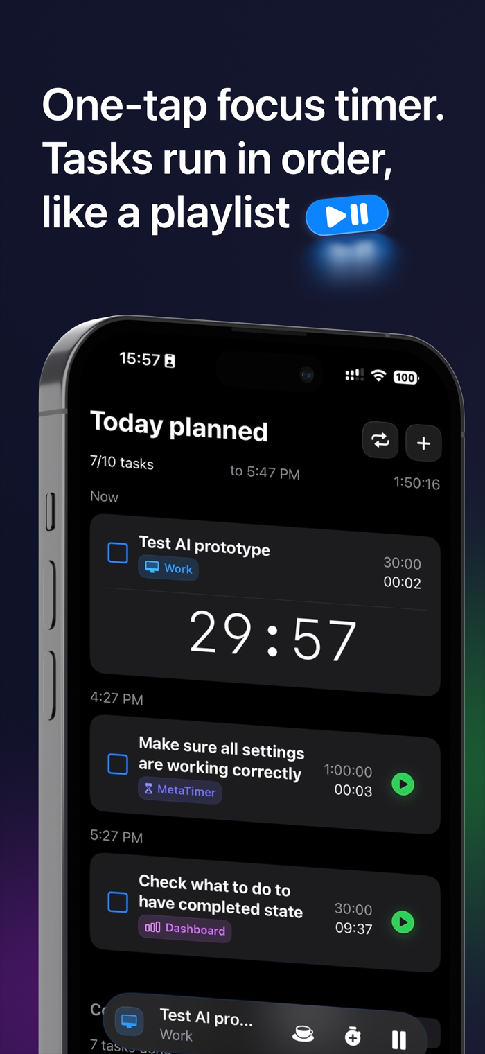 MetaTimer takes the strengths of Pomodoro timers, daily planners, and time tracking tools but removes the rigidity. You can create sessions as short or as long as you like, pause and resume without breaking your flow, and re-order tasks when life changes direction. Instead of punishing you for breaking focus, the app encourages small wins and helps you return to flow quickly.