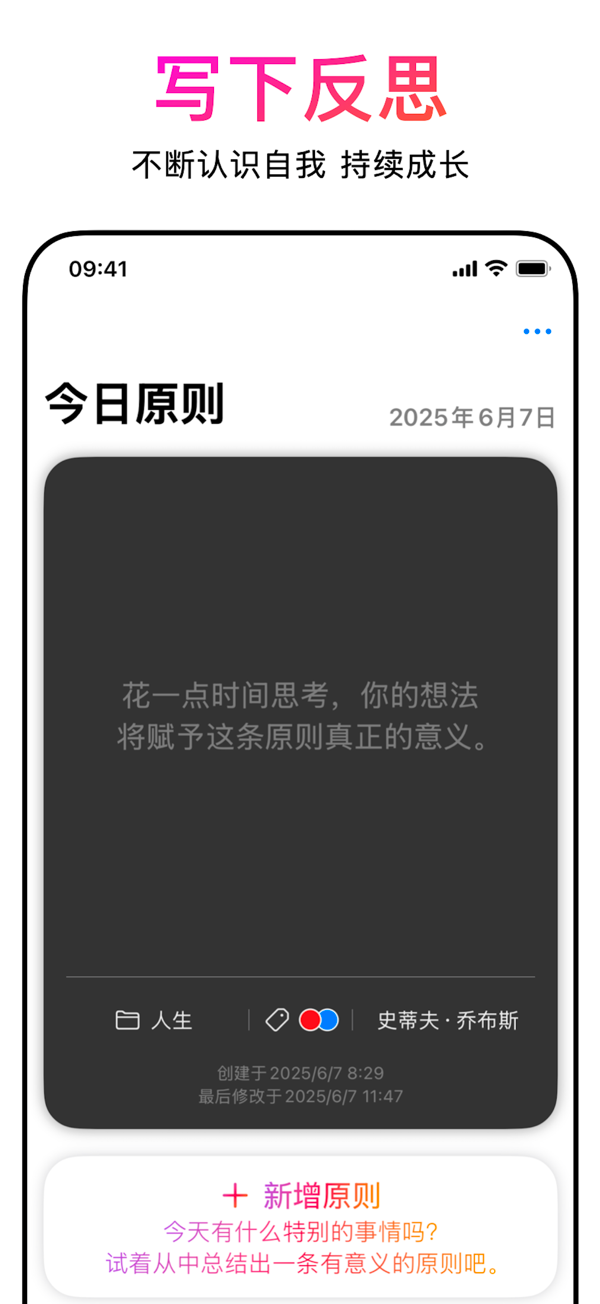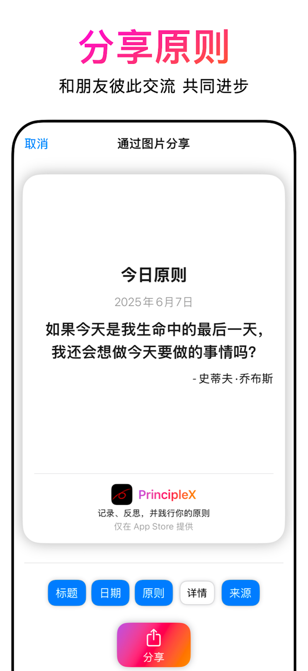 PrincipleX是一款原则工具,能记录管理个人原则,支持文件夹分类与标签管理。有每日自动提醒践行原则功能,可固定重要原则为提醒内容,还能为每条原则撰写反思促进自我成长。具备云端同步、跨设备无缝访问特性。此外,也可记录名人名言等内容,还能作习惯记录工具助保持自律、管理日常习惯以促进个人成长。使用条款:https://www.apple.com/legal/internet-services/itunes/dev/stdeula/