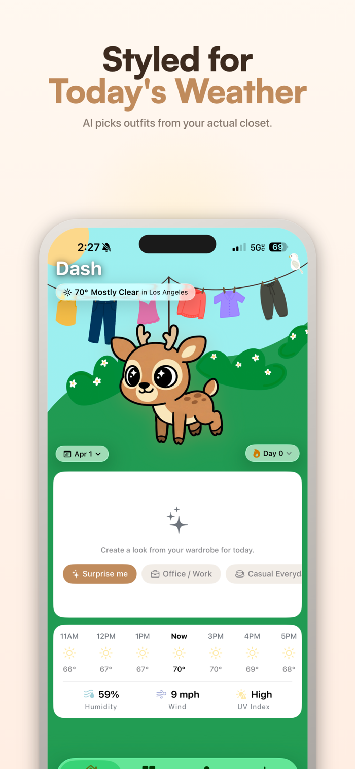 Wake up to a curated outfit picked for your day — weather-aware, occasion-ready, and styled to your taste. Don't like it? Regenerate or swap individual pieces.