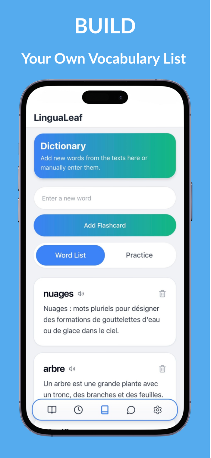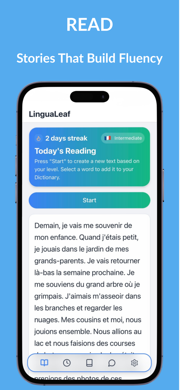 Read engaging stories at your level, practice writing with AI chat bot, and build vocabulary as you go. Tap unfamiliar words to save them, review them later, and strengthen your understanding through context.
