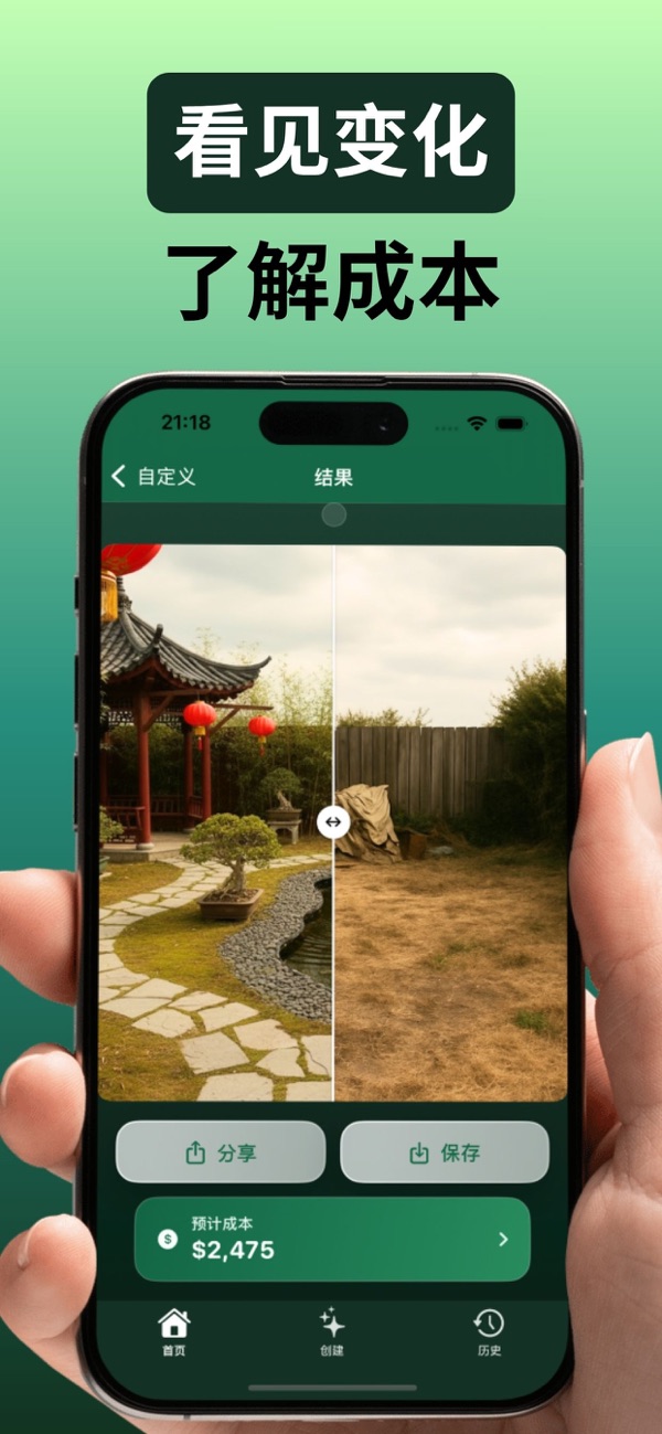上传照片,AI即时生成逼真的前后对比效果,看看不同风格的庭院改造方案。
