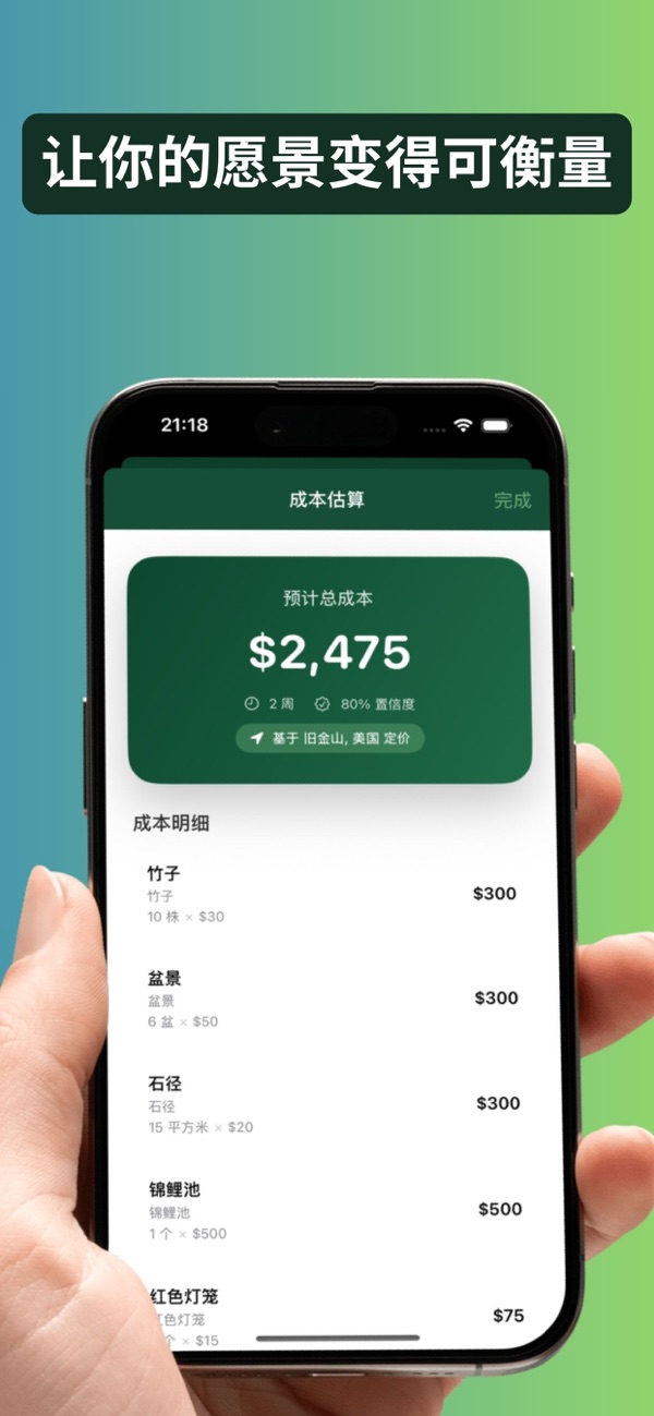 清楚了解项目成本——包括草坪、庭院、泳池、露台、照明及植物。iYard会立即计算材料与人工费用的预估值。