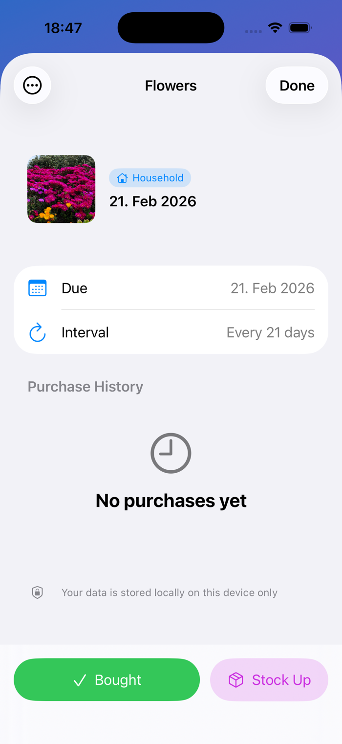 - One tap: “Bought” updates your schedule and learns your real rhythm