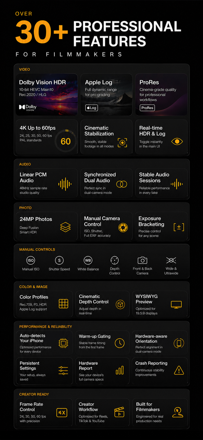 Built for filmmakers, vloggers, and content creators who move fast and ship across formats. Over 30 professional cinematographer features in a single camera app.