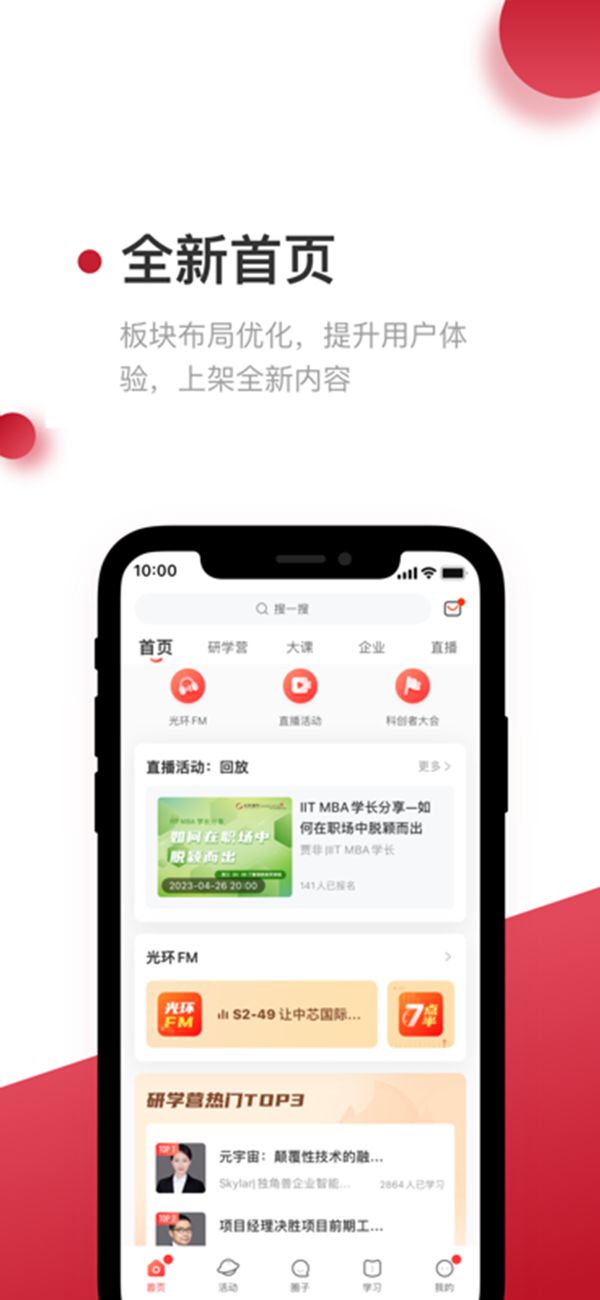 基于这个目标,光环创建了主力大课、研学营、社区等多个板块,并推出项目管理、产品经理、人工智能、大数据等前沿课程,助力科创者多维度学习提升。