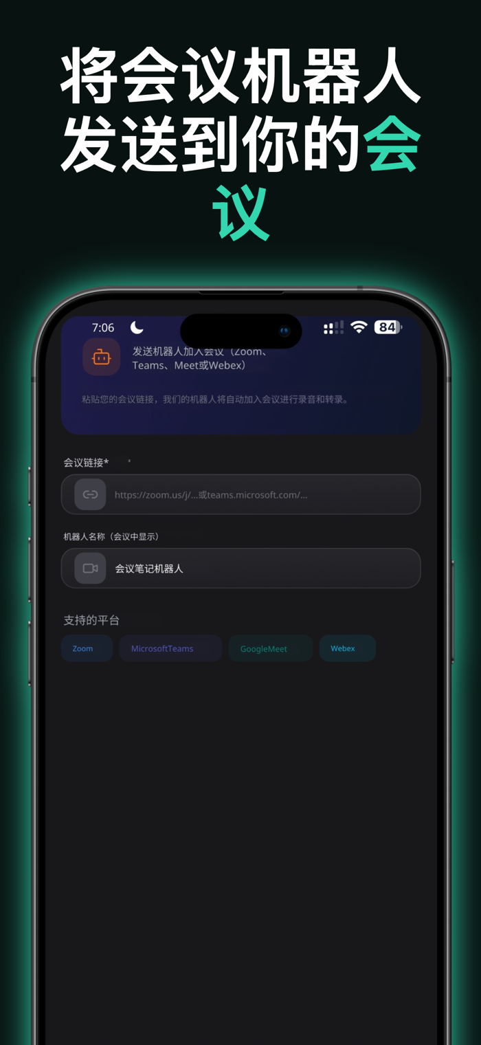 会议机器人 粘贴会议链接,MeetingMark会发送机器人加入您的Zoom、Microsoft Teams、Google Meet或Webex通话。机器人自动录制和转录,让您专注于对话。实时跟踪机器人状态。