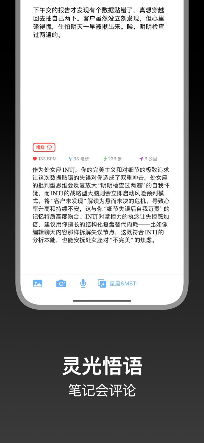 • 灵光悟语(高级功能):定制你的专属 AI,获取贴合需求的洞察 —— 它可以是暖心陪伴的挚友,也能是擅长分析的 MBTI 性格向导,还可以是学习搭子。