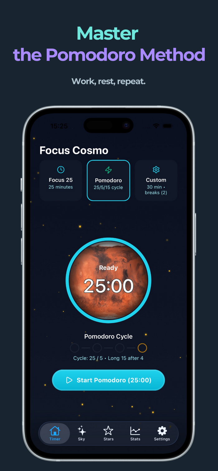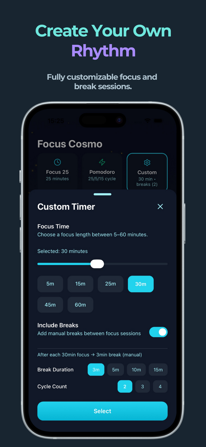 • Pomodoro & Custom Cycles: Choose between classic Pomodoro sessions or fully customizable focus and break durations.