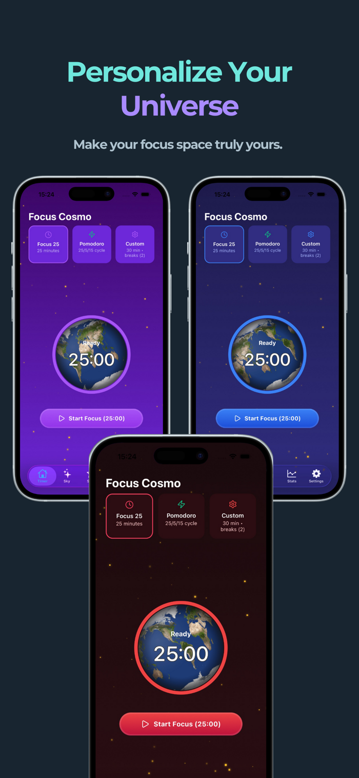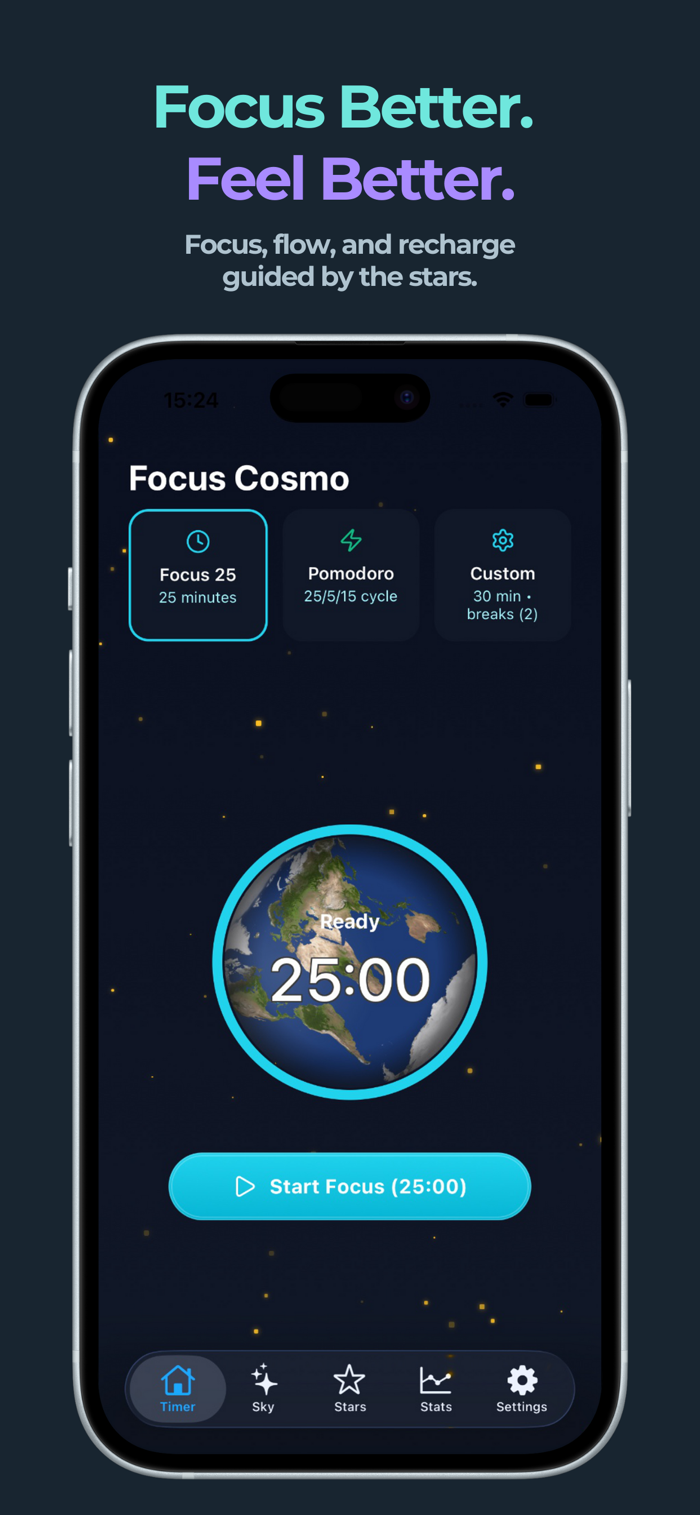 • Focus Timer: Stay present with a clean, minimal interface inspired by the universe.