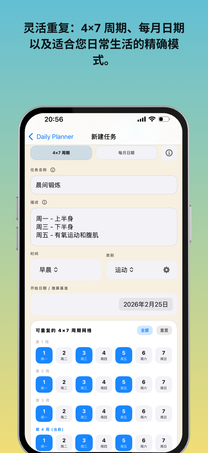 - 4×7 周期(28天网格)— 非常适合训练和“按周”计划