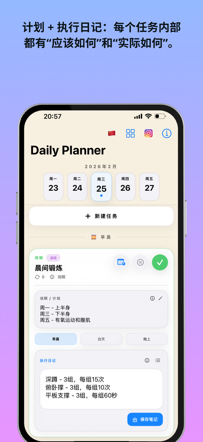 Daily Planner 不仅显示“计划了什么”,还显示“实际发生了什么”: