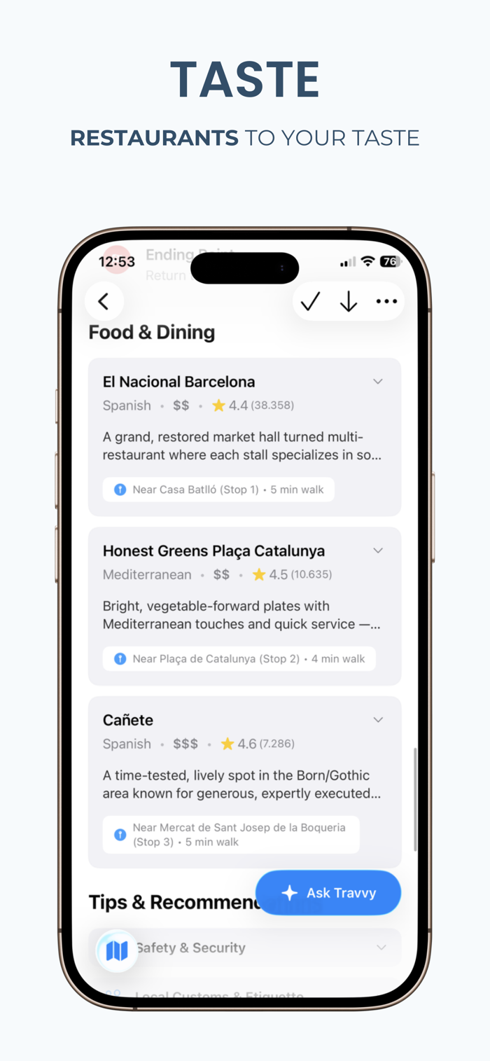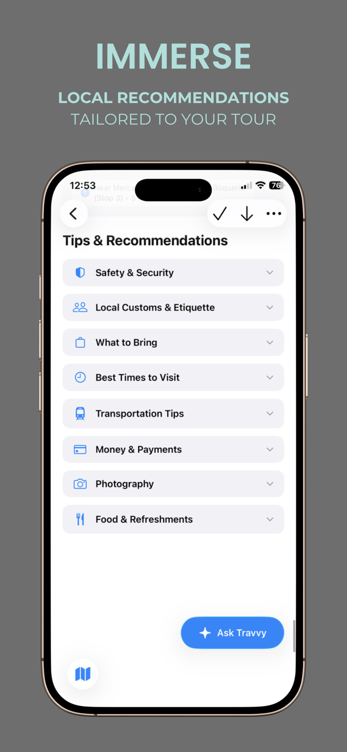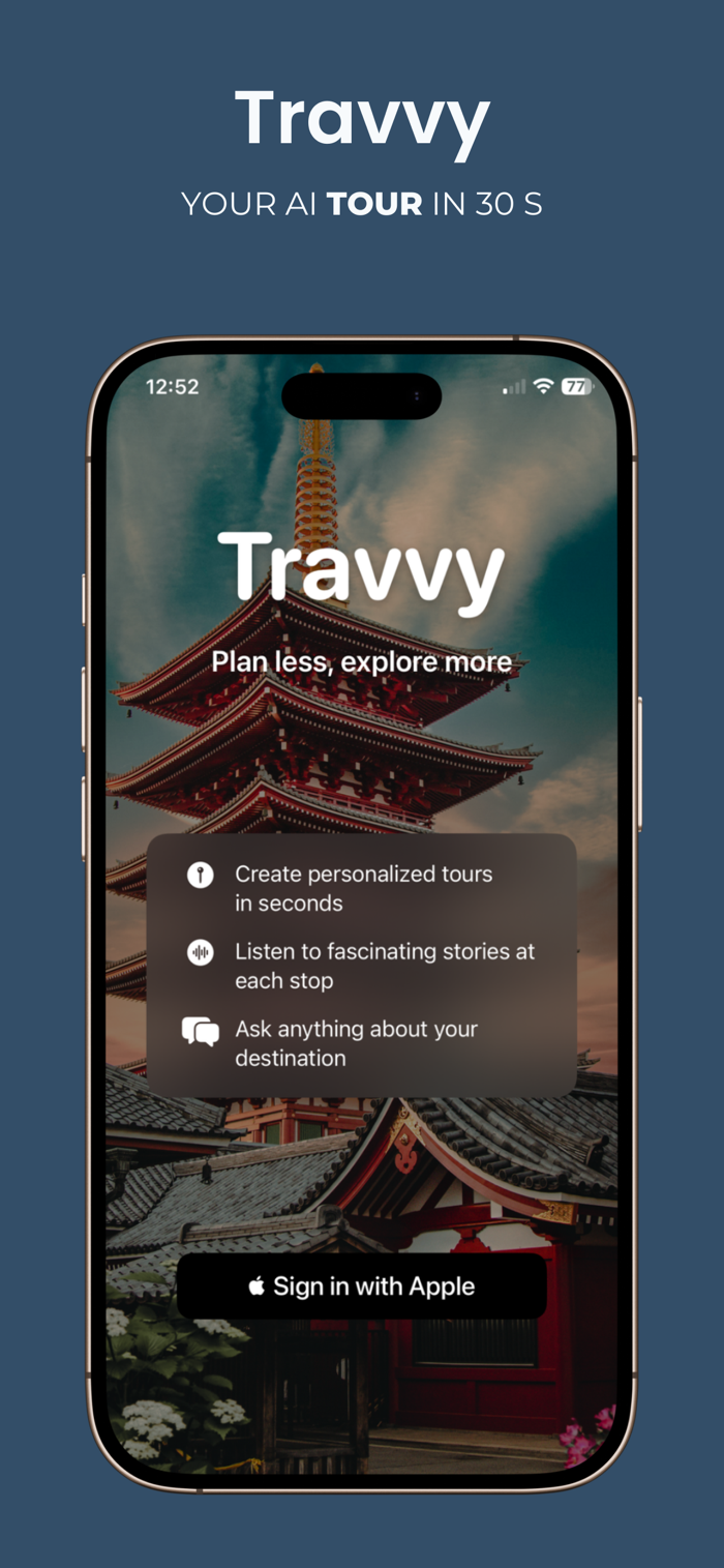 Travvy 能让你如口袋中有导游般探索城市。轻点创建旅行,AI 为你规划路径,涵盖站点、故事与惊喜。它依你所选城市、起止点、兴趣、时间及出行方式定制 AI 旅行,提供优化路线、站点与地图,还有 2 - 3 分钟语音导览及离线模式。具备真实个性化,支持随时编辑,有 AI 助手即时答疑,提供附近按口味和价格的餐厅、当地实用小贴士、各站点开放时间等。