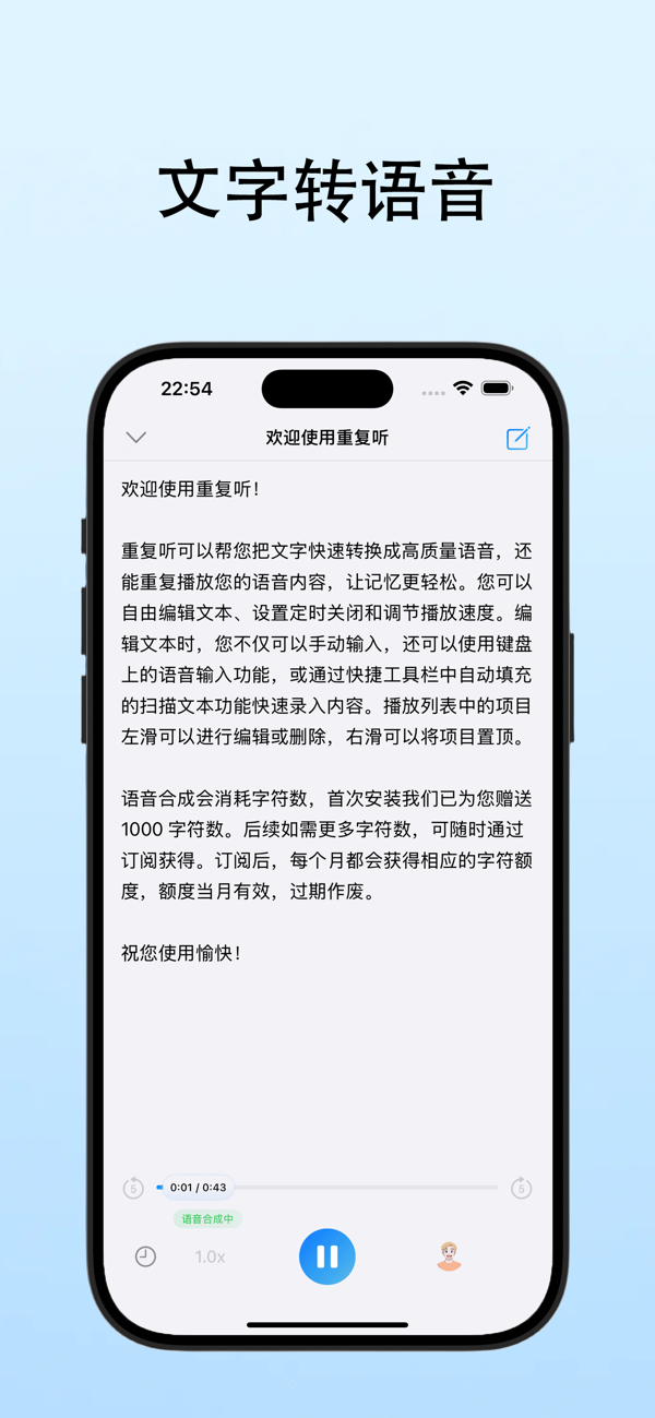 重复听是一款专为高效学习和记忆打造的语音工具。只需输入文字,即可一键转换为高质量语音,随时随地反复播放,帮助你轻松掌握每一个知识点。不论是朗读文本、背单词、准备演讲,还是收听备忘、利用碎片时间反复听记重点内容,重复听都能成为你的贴心助手。