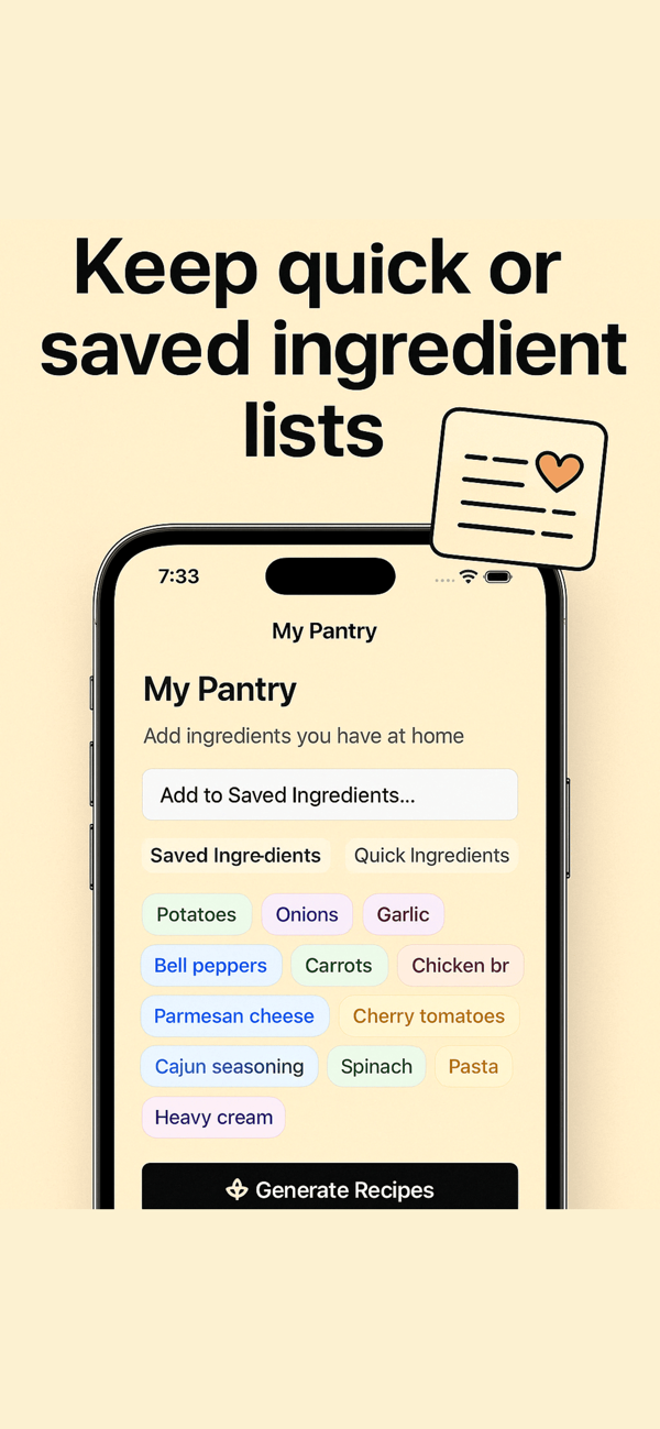 Pantry Recipes,厨房神器,让您轻松玩转现有食材!只需简单输入您的食材,立即生成美味菜谱。保存常用食材,快速添加夜宵食材,AI大厨秒速提供个性化创意菜谱。编辑修改随心所欲,设计简洁美观,使用便捷高效。节省时间,减少浪费,享受更优质的餐饮体验。