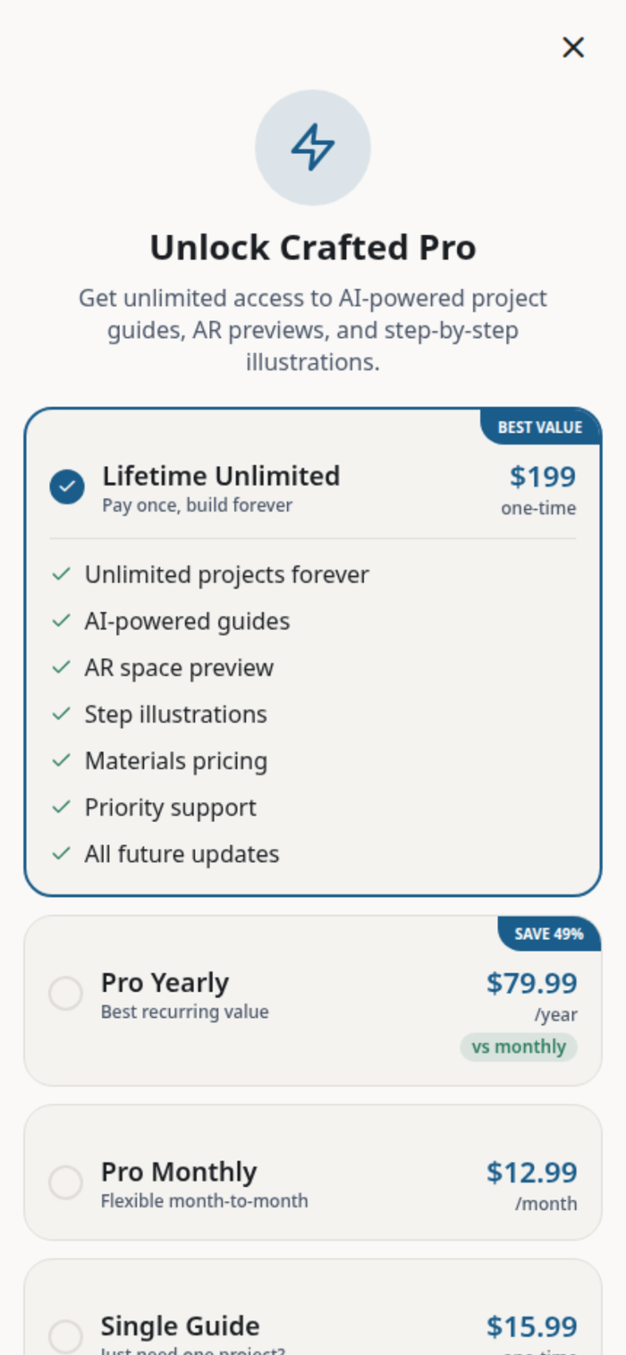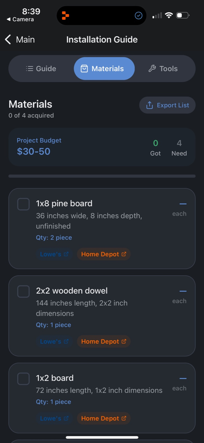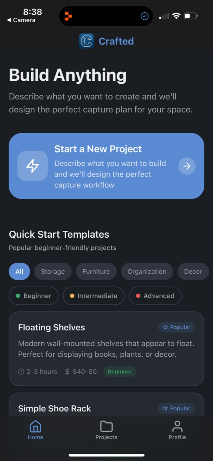 只需描述你想制作的东西,拍摄一张你空间的照片,让人工智能来完成繁重的工作。精心打造会分析你的房间,给出最佳制作方案,并为你精确的空间创建一份完整的分步安装指南。