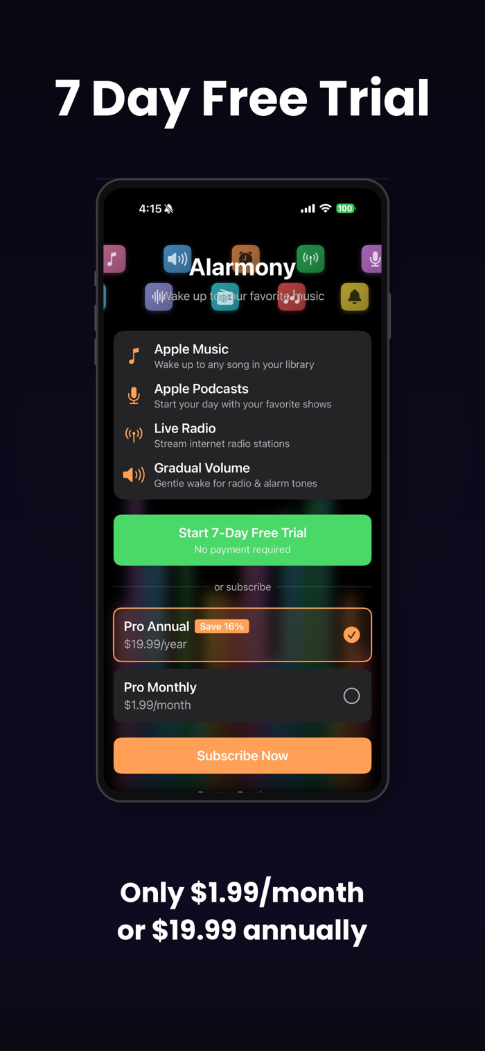Alarmony lets you wake up to the music, podcasts, and radio you love. Set a song to start your morning, then automatically transition to a podcast or radio station — all from one alarm.