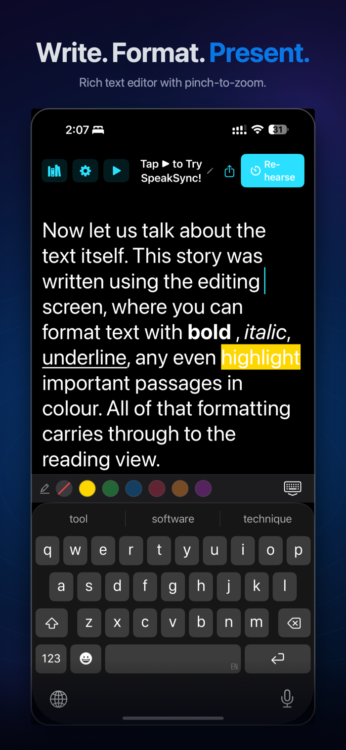 Write and format your scripts directly in the app. Pinch to zoom, and use the built-in formatting tools for bold, italic, and underline. Auto-save means you never lose your work.