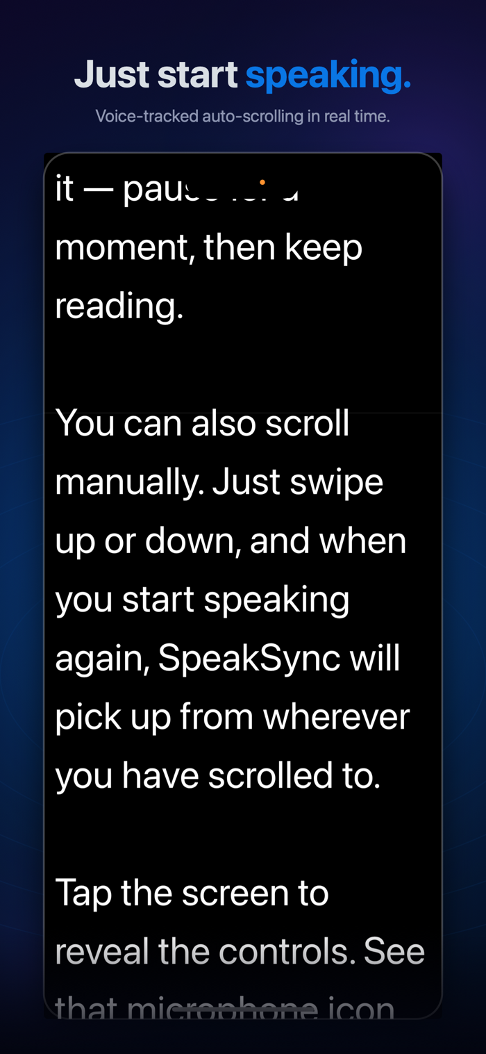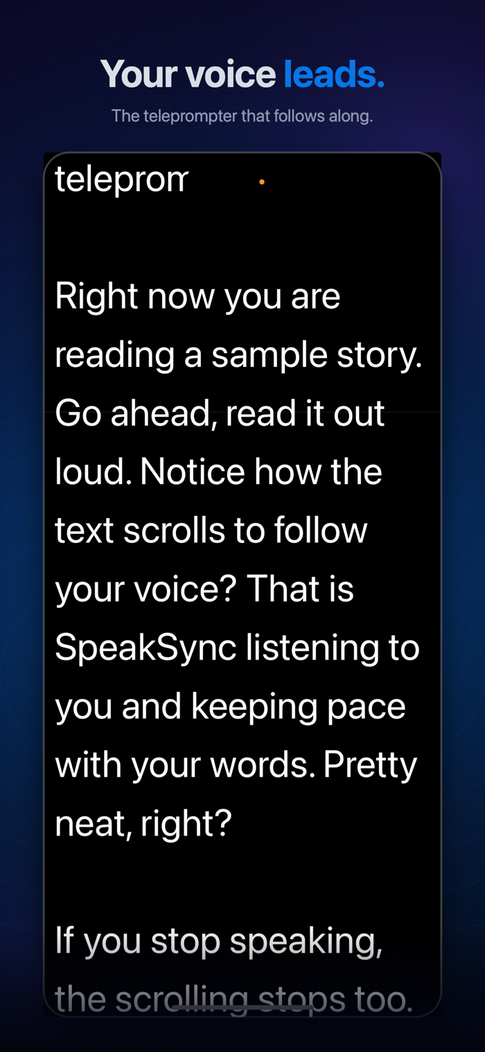 SpeakSync is a voice-tracking teleprompter for iPhone and iPad. Just start speaking and your script scrolls automatically, following your natural pace in real time.