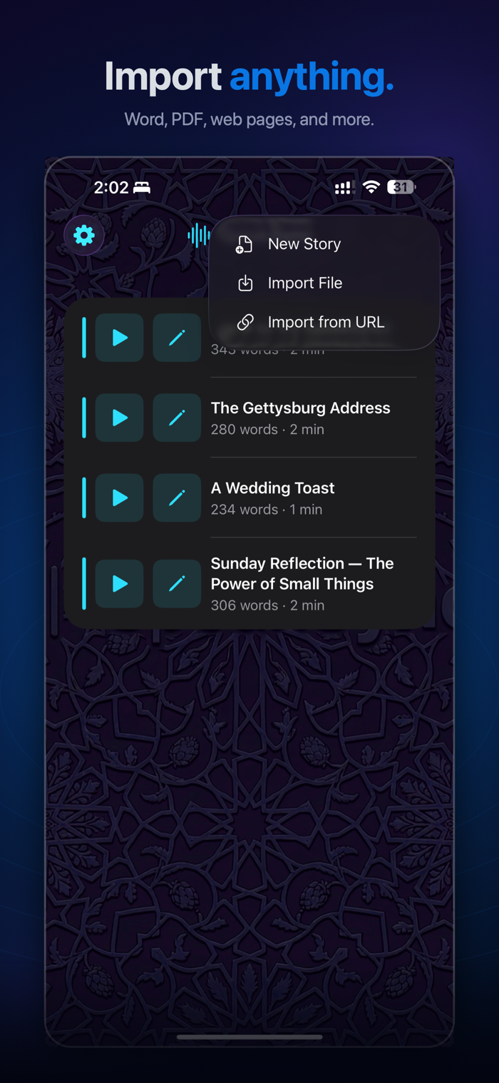 Bring in scripts from Word documents, PDFs, rich text files, plain text, web pages, and more. Bold, italic, and underline formatting is preserved. Just tap the + button and you're ready to go.