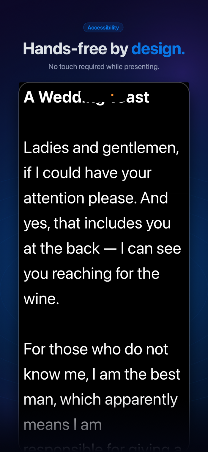 The Prompter is fully voice-controlled — no touch interaction required while presenting. SpeakSync scrolls by listening, making it accessible to users with motor impairments or anyone who simply can't touch the screen while speaking. Set up your script, start voice tracking, and your hands are free.