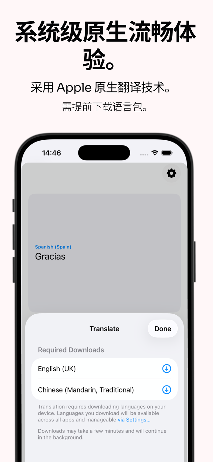我们采用与操作系统兼容的先进翻译引擎,在追求美观直观界面的同时,最大限度地降低电池消耗,从而提升 iPhone 的性能。