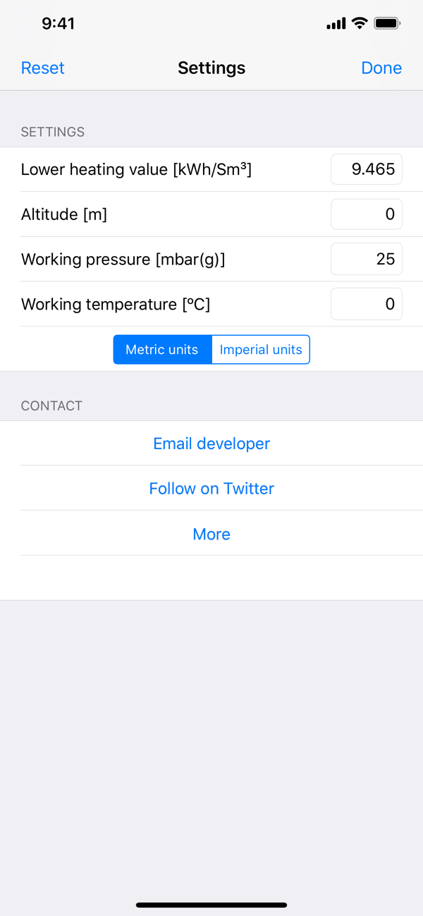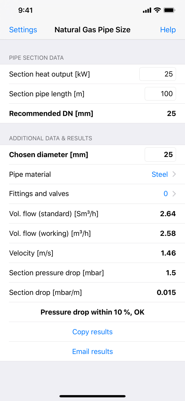 Natural Gas Pipe Size app can perform calculations using metric or imperial units.