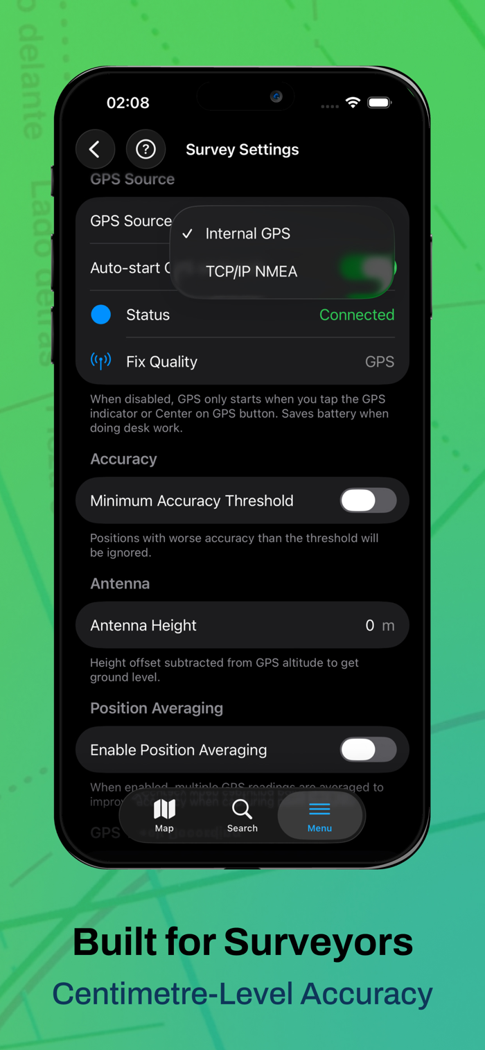 连接到通过TCP/IP传输NMEA数据的外部GNSS接收器,以实现高精度定位。查看HDOP、VDOP、PDOP、定位类型和卫星星座数据。与RTK校正坐标流兼容。