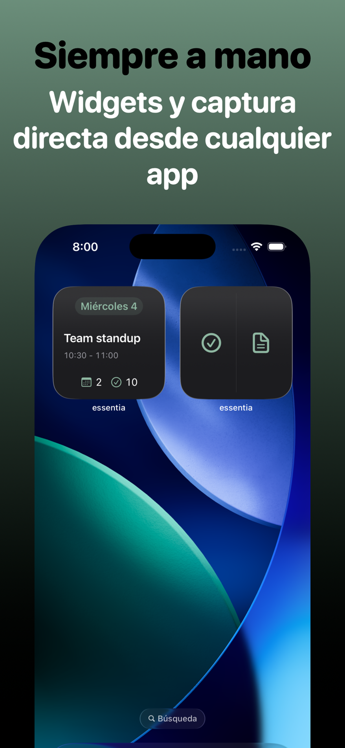 Usa el widget, la extensión para compartir desde cualquier app, o escribe directamente en essentia. Vacía tu mente y procesa después.