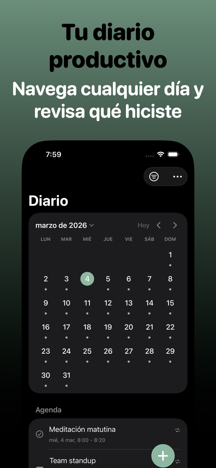 No arrastres la lista de ayer. Cada mañana, revisa lo pendiente con un solo toque: muévelo a hoy, replanifícalo o déjalo ir.