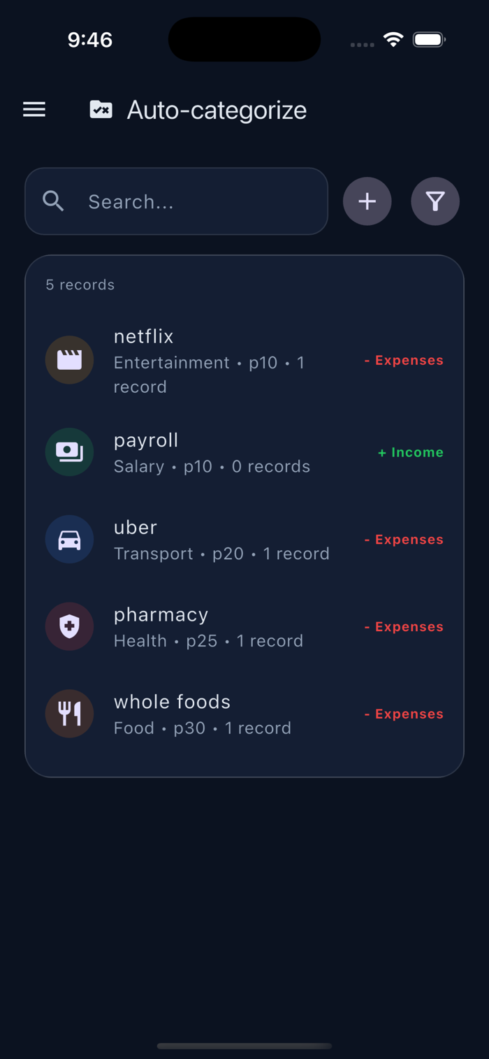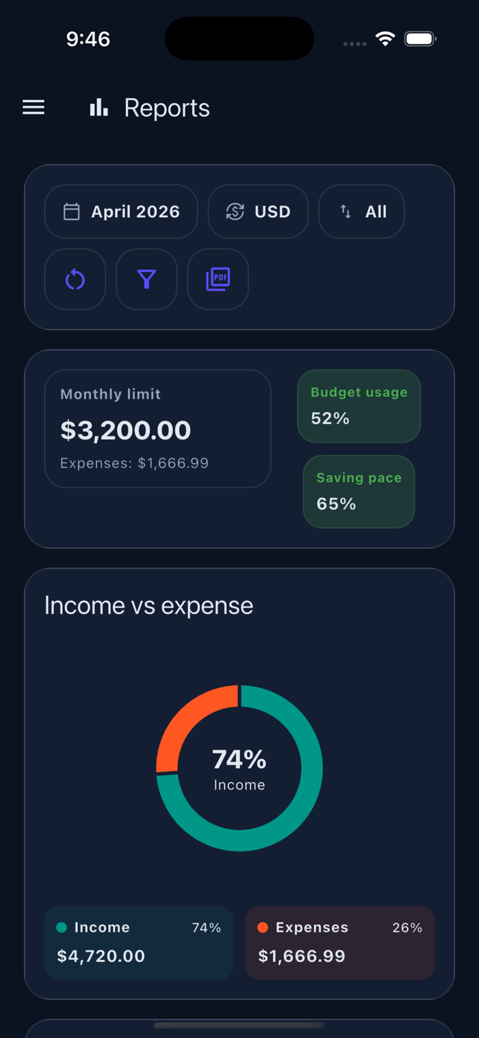 The dashboard gives you a fast overview of your financial health. You can check your current balance, review monthly expenses, and explore insights that help you spot patterns in your spending. Reports and visual summaries make it easier to analyze your finances and identify opportunities to improve. If you want to keep a record outside the app, you can also export reports as PDF.