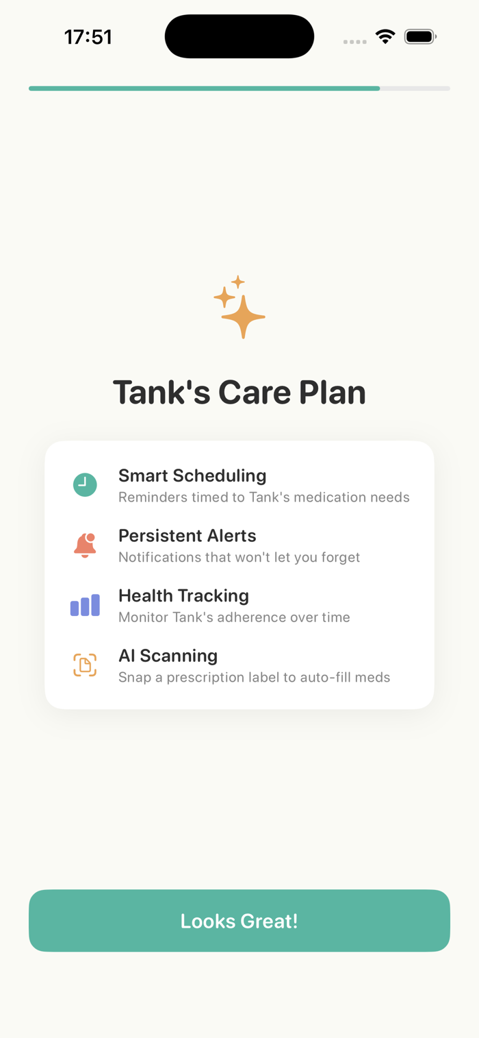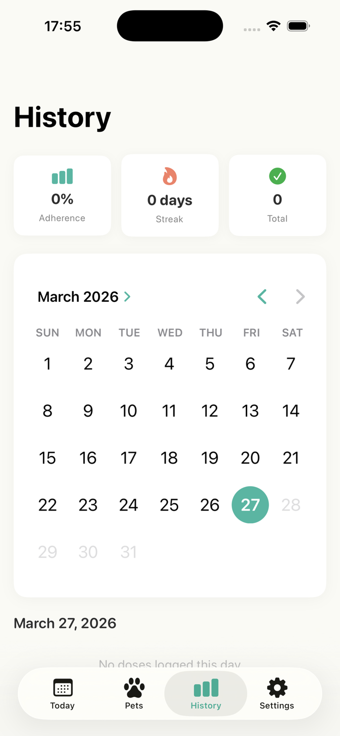 Add your pets and their medications in seconds. Get persistent reminders that won't let you forget. Log each dose with a single tap. See your adherence history at a glance.