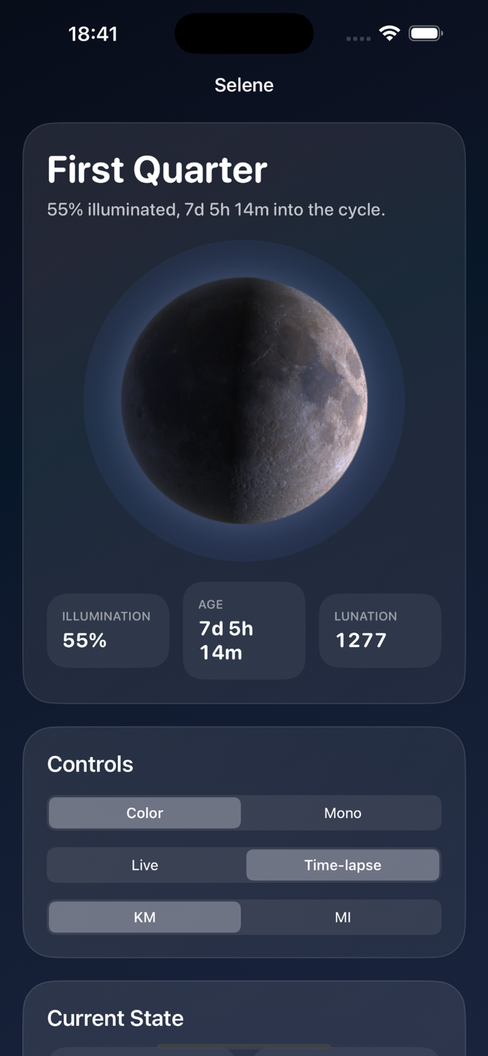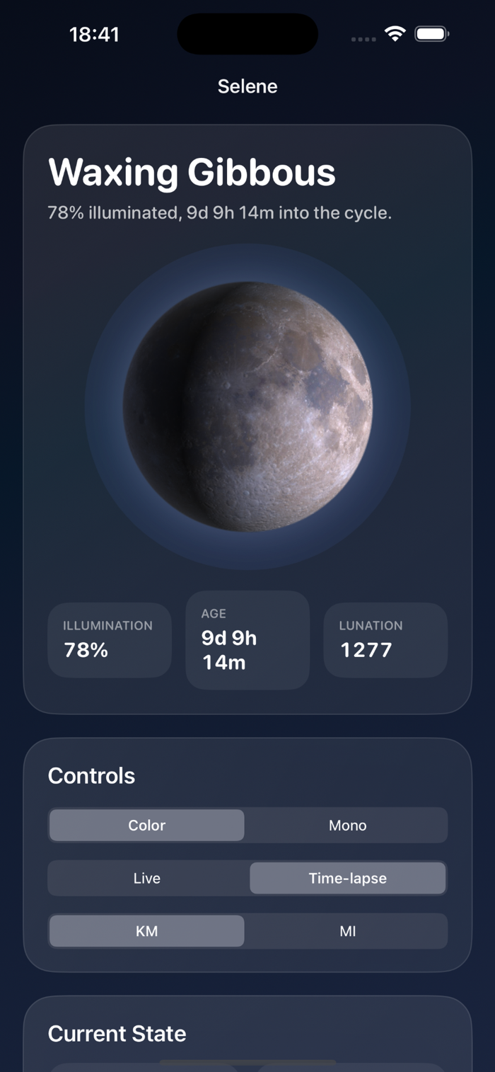 It shows the current lunar phase, illumination, lunation, and key cycle data in a clear, native interface. Selene computes its core data locally on the device and is designed both for a daily glance at the Moon and for exploring change over time.