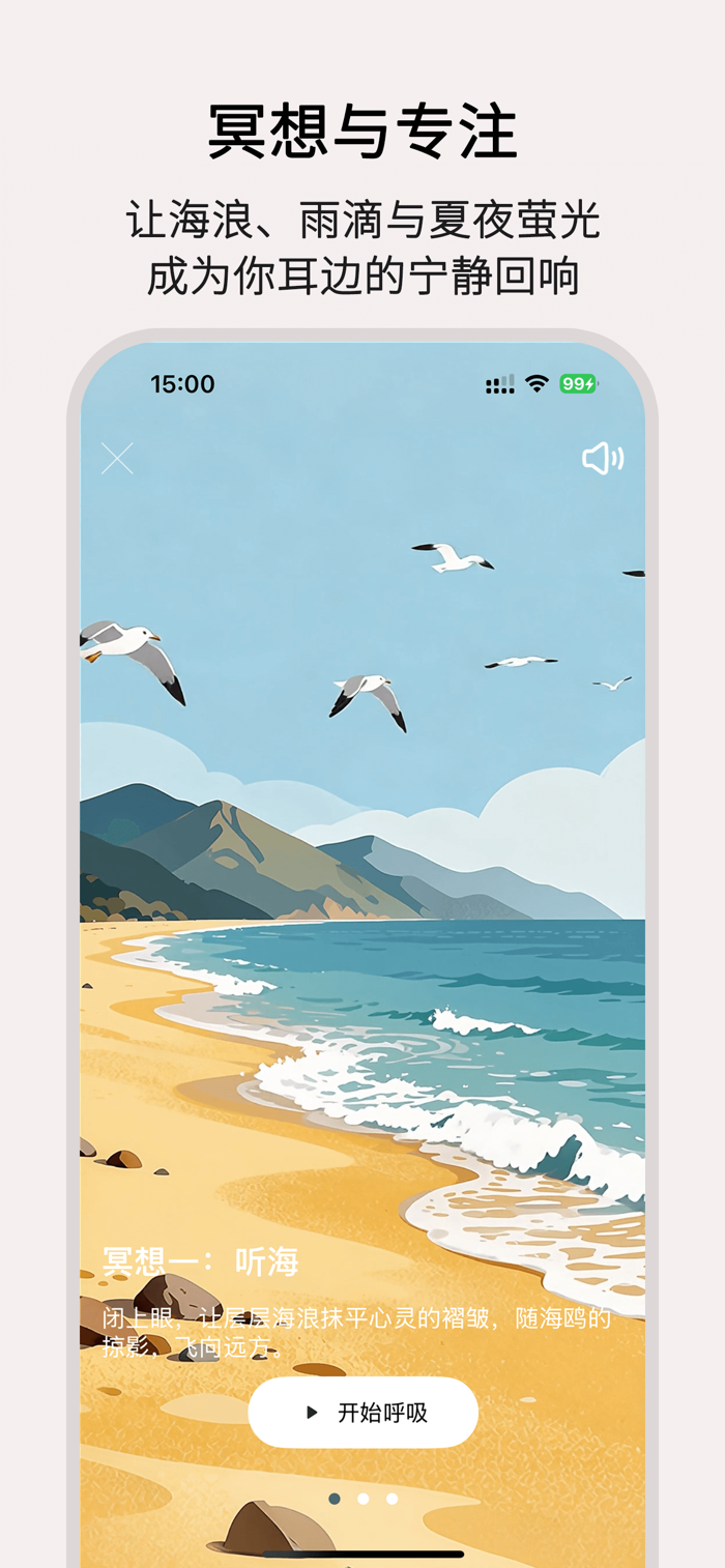 • 开启专注冥想:在海浪、雨声与夏夜虫鸣的视频与声音陪伴中进入心流,训练思绪,平和内心。让海浪、雨滴与夏夜萤光,成为你耳边的宁静回响。
