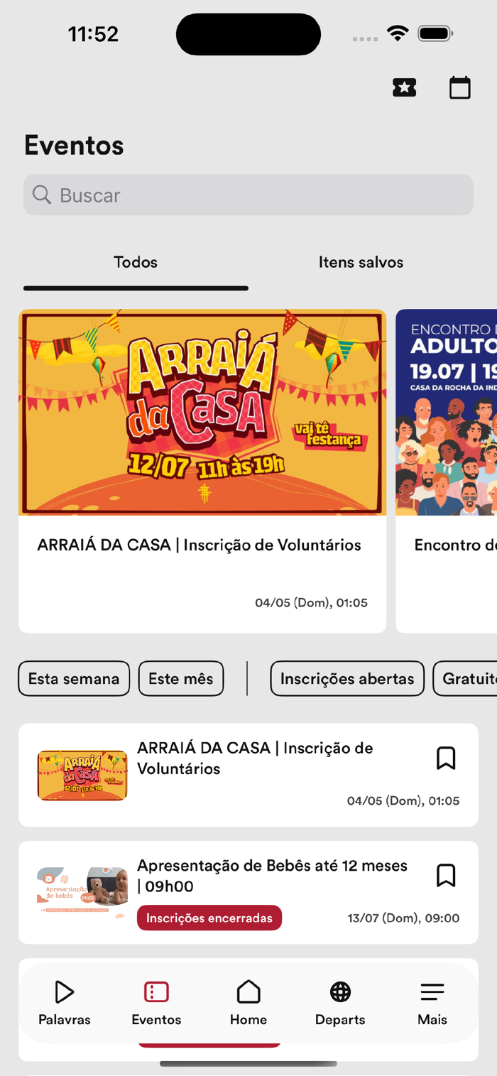 - Siga a agenda e fique por dentro de tudo que acontece na igreja, inscreva-se em eventos e tenha seus ingressos sempre com você.