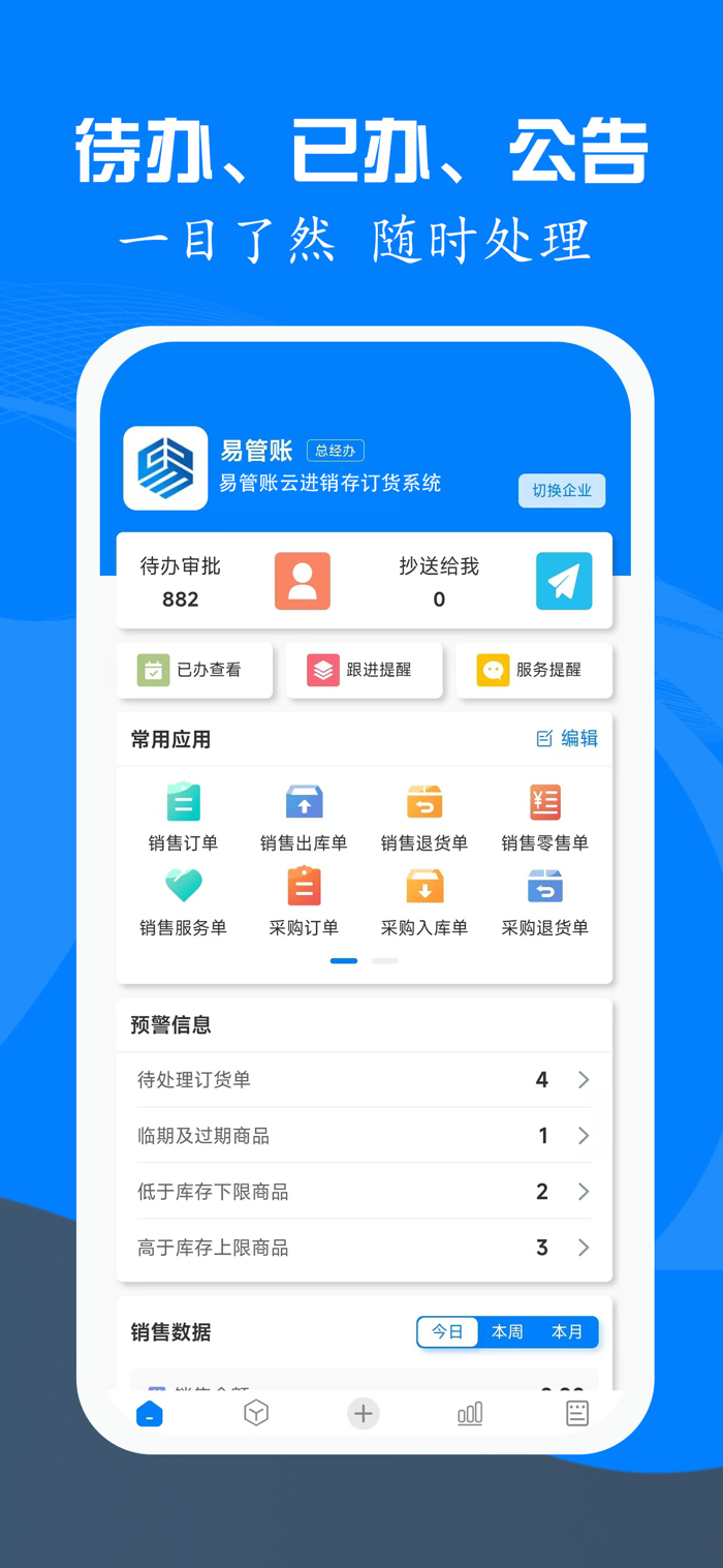 易管账云进销存订货系统,集客户管理+进销存+服务管理+费用管控+资金管理+分享订货为一体,是您生意管理好帮手。 简单易用,操作便捷,使用就像发朋友圈一样简单,非专业人士也能快速上手。一套系统融合了“进销存ERP+分享订货+CRM+办公审批+资金费用”,生意管理,一套搞定。 轻应用理念,免去客户订货时的下载、注册、登录过程;减少系统运营成本,让使用更加简洁。 全功能开发,无需额外付费,模块自由开关,傻瓜式操作,简而不减,非专业人士也能快速上手。