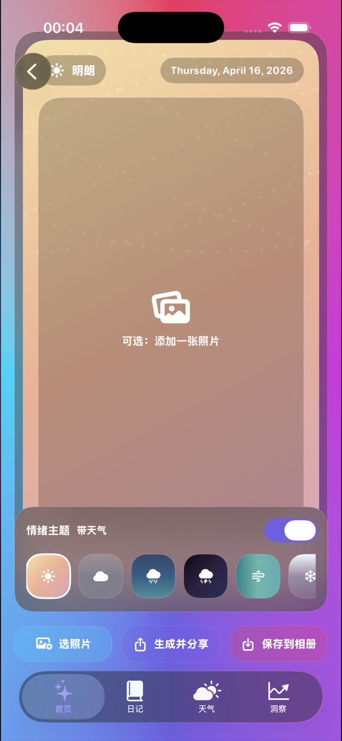 记录、看见、放下。写一条日记,生成一张海报,做一次呼吸。情绪有晴雨,这里都容得下。