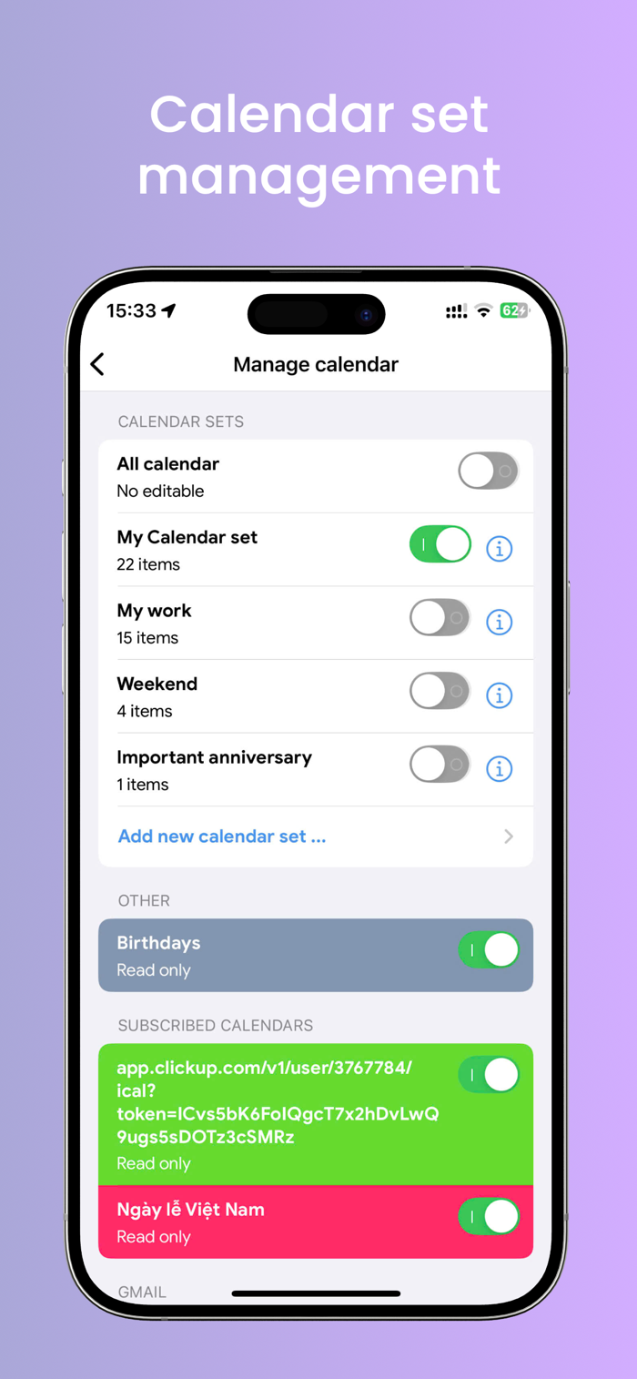 - Calendar Set - quickly turn multiple calendars on or off with a simple click, or automatically when you leave or arrive, based on location