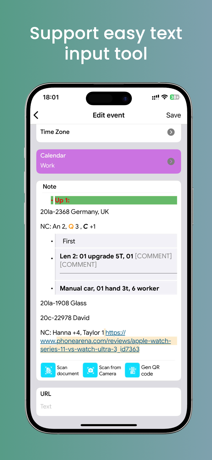 - Formats text, create new calendar set, tool import content from document, Camera, gen QR Code